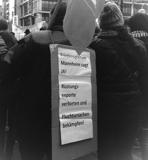Auch die Deutsche Friedensgesellschaft-Vereinigte KriegsdienstgegnerInnen (DFG-VK) und das Friedensplenum Mannheim haben zu dieser Aktion aufgerufen und dafür geworben. Wir haben dabei auf wesentliche Ursachen für Fluchtbewegungen hingewiesen: Rüstungsexporte und Militäreinsätze.
