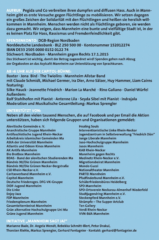 Aus dem in der linken Spalte abgebildeten Flyer geht im Absatz AUFRUF hervor wofür es bei der Aktion geht und dass sie von der Initiative "Mannheim sagt Ja!" gestartet wurde. Außerdem wird das Spendenkonto genannt, damit die dabei entstehenden Kosten gedeckt werden können und das Asylcafé unterstützt werden kann. Außerdem sind die Musikerinnen und Musiker genannt die in der Capitol-Bühne auftreten. Und schließlich werden die Unterstützer genannt, die sich bis Silvester genannt haben.