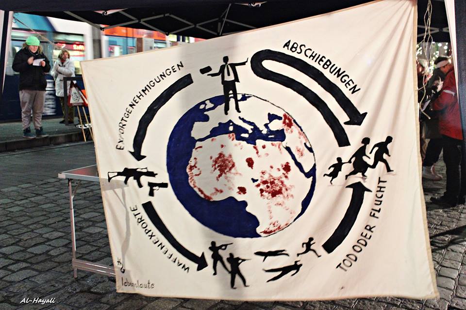 "Menschen werden nicht als Flüchtlinge geboren, sie werden dazu gemacht", heißt es im Aufruf. Eine wichtige Rolle spielen dabei die aus Deutschland gelieferten Waffen mit denen Menschen getötet, verletzt und vertrieben werden. Deshalb setzen wir uns für ein Rüstungsexportverbot ein und sind Mitglied der Kampagne Aktion Aufschrei - Stoppt den Waffenhandel! Ihr Motto bringt es auf den Punkt: Grenzen öffnen für Menschen - Grenzen schließen für Waffen! Alle Bundesregierungen der letzten Jahrzehnten sind dafür verantwortlich, dass die Welt mit Gewehren, Kriegsschiffen, Jagdflugzeugen, Panzern und anderem Kriegsgerät überschwemmt wird.