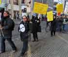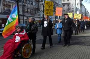 Den Passanten in der Breiten Straße und auf den Planken bot sich am Samstag (20.2.2010) ein ungewöhnlicher Anblick: Rund 60 Personen zogen im Gänsemarsch durch Mannheims Fußgängerzone. Etliche der Teilnehmer trugen Plakate oder eine Maske auf der Brust oder im Nacken.