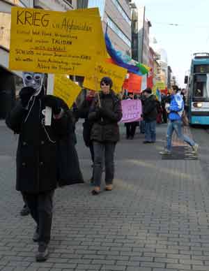Mit den Masken drückten die Teilnehmer ihre Trauer für die vielen in Afghanistan umgebrachten Menschen aus. Eigentlich wollten sie Masken vor dem Gesicht tragen. Das aber wollte die Polizei nicht zulassen, denn sie sah darin einen Verstoß gegen das Vermummungsverbot im unlängst verschärften Versammlungsgesetz.